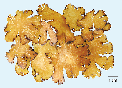 Irregular and nodular, fist-shape a pieces; 2-7 cm in diameter. Outer surface dull yellowish-brown, rough and wrinkled, with numerous protuberant annular (ring-like) nodes; top end with dented suborbicular (almost round) stem scars; lateral side of lower part and annular nodes with numerous small strumiform (cushion-like) root scars. Hard and solid, do not break easily. When broken, surface yellowish-white or greyish-yellow, with an undulate (wavy) cambium ring and criss-crossing striae, scattered with punctiform (dot-like) yellowish-brown oil cavities. With a distinctive and strong fragrance; taste: bitter, acrid, slightly tongue-numbing and then slightly sweet.