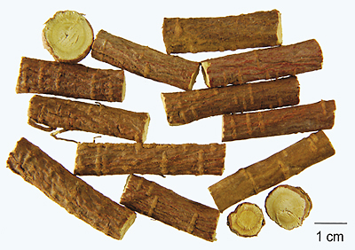 Root cylindrical; 25-100 cm long, 0.6-3 cm in diameter. Bark varies in tightness; reddish-brown or greyish-brown; marked with conspicuous longitudinal wrinkles, grooves and sparse rootlet scars; lenticels lalongate (transversely elongated). Hard and solid; heavy; when broken, surface slightly fibrous, yellowish-white, starchy, marked with a conspicuous cambium ring, radial markings and clefts. Rhizome cylindrical; outer surface with bud scars; cross-section with pith in the centre. Odour: faint; taste: sweet and distinctive.
