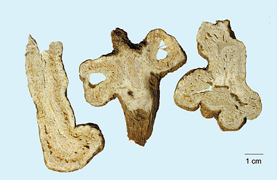 Plump pieces irregular in shape; 3-13 cm long, 1.5-7 cm in diameter. Outer surface greyish-yellow or greyish-brown; marked with irregular strumiform (cushion-like) protuberances, interrupted longitudinal wrinkles and grooves, and scars of rootlets; top end marked with caudex remnants and bud scars. Hard, does not break easily. When broken, surface uneven; transverse section of Shengshaizhu pale yellowish-white to pale brown, with chrysanthemum markings and scattered brownish-yellow oil dots; transverse section of Hongzhu cuticular, deeper in colour and with clefts. Odour: fresh and fragrant; taste: sweet and slightly acrid; slightly sticky when chewed.